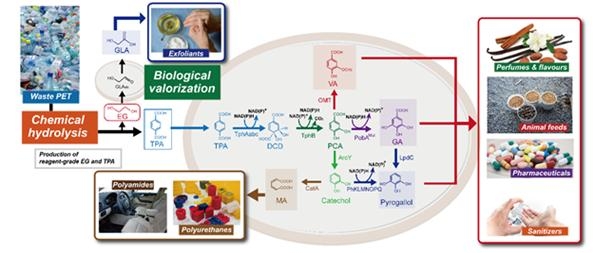 이어 미생물로 테레프탈산과 에틸렌글리콜을 유용한 소재로 전환하는데 성공했다. 테레프탈산은 갈산(92.5%), 카테콜(90.1%), 피로갈롤(20.8%), 뮤콘산(85.4%), 바닐락산(29.4%)으로, 에틸렌글리콜은 글라이콜산(98.6%)으로 전환됐다.