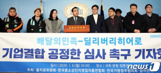 을지로위원회와 한국중소상인자영업자총연합회, 전국가맹점주협의회, 참여연대, 라이더유니온민주노총 서비스연맹 서비스일반노조 배달서비스지부는 6일 오전 국회에서 기자회견을 열고 이 같이 밝혔다. 지난해 12월30일 배달의민족과 독일계 배달서비스 기업 딜리버리히어로의 기업결합심사서가 공정위에 접수된 것에 대응하기 위한 회견이다.