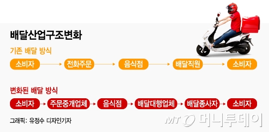 이는 배달앱 등장으로 배달 산업의 구조가 바뀌었기 때문이다. 배달 앱이 등장하기 이전엔 소비자가 직접 음식점에 전화해 주문을 하는 경우가 대부분이었다. 음식점들은 음식 배달원을 직접 고용했다. 홀에서 주문한 음식값에 서빙직원의 인건비가 포함된 것처럼 배달 주문한 음식값에 배달원의 인건비도 포함된 셈이다.