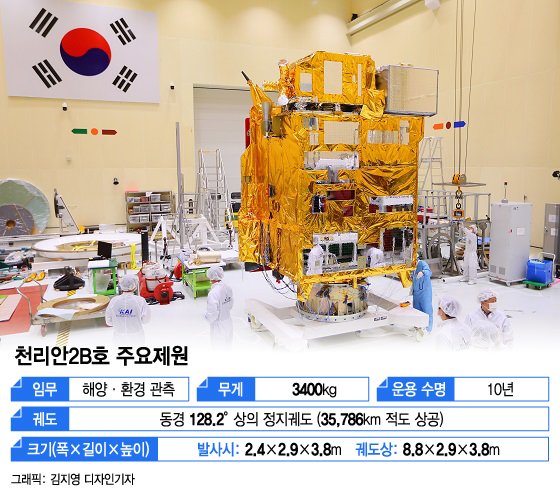2B호는 2018년 12월 발사된 기상 관측 위성 천리안 2A와 본체는 같지만 임무 수행을 위한 탑재체만 다른 쌍둥이 위성이다. 전 세계 정지궤도 위성 중 최초로 환경 탑재체(GEMS)를 실었다. 2B호는 지난달 5일 대전 한국항공우주연구원(이하 항우연)을 떠나 항공편으로 다음날 기아나 우주센터에 도착했다. 이후 현지에서 추진제 충전, 발사체 어댑터 결합 등 한 달 간 발사 준비를 해왔다.