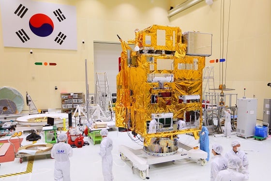 직육면체 형태 위성 본체 한쪽 옆에는 거대 태양전지판이 부착돼 있다. 발사 전엔 빨간색 판에 덮힌 채 접혀 있다. 전지판 겉면의 오염을 방지하기 위해 씌워둔 것이다. 펼친 태양전지판의 총 길이는 8.8m이다.