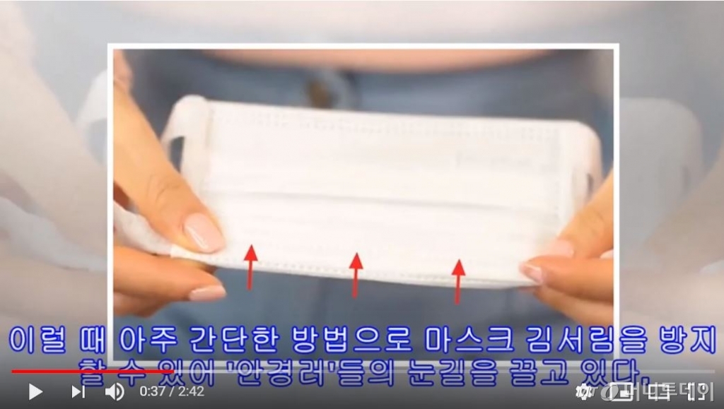 마스크 상단 코에 걸쳐지는 와이어 부위을 바지단 접듯 1㎝가량 안쪽으로 살짝 접어서 주름을 만들어주면 된다. 이후 마스크를 착용하면 접힌 부분이 새어나오는 날숨을 막아 안경의 김서림을 상당부분 줄여준다. 마스크와 피부가 밀착하는 효과가 커져서다.