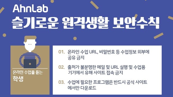 다음은 온라인 개학을 맞아 원격 수업 시 보안사고 피해를 막기 위해안랩(59,700원 ▲100 +0.17%)이 10일 제시한 '슬기로운 원격생활 보안수칙'이다.