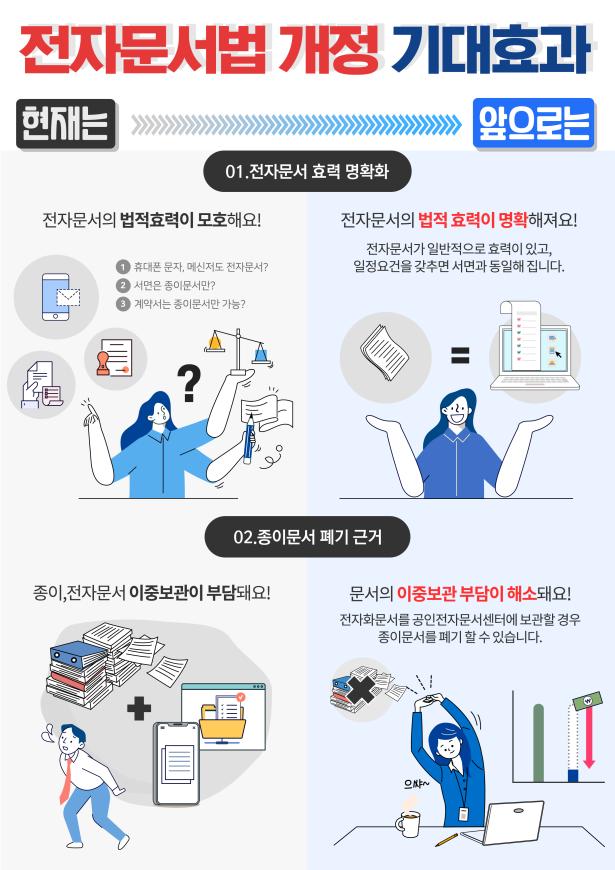 이번 법개정으로 제4차 산업혁명에 필요한 전자문서 이용이 사회전반으로 확산될 전망이다. 실제 2018년 기준 3000여개의 법령, 2만개 조항에서 서면과 문서등을 요구하고 있다. 이를 모바일고지서나 전자영수증, 전자처방전 등 전자문서로 변환하면 6000억원 규모의 전자문서 신규시장이 창출되고 종이문서 보관 및 물류비용 관련 1조1000억원의 경제적 비용절감효과가 예상된다. 이번 개정안은 공포 후 6개월인 오는 12월부터 시행된다.