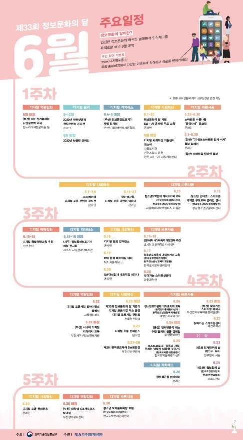 과학기술정보통신부와 한국정보화진흥원은 ‘디지털로 하나 되는 대한민국, 다 함께 누리는 디지털 포용세상’을 주제로 6월 한 달 동안 제33회 정보문화의 달을 운영한다고 4일 밝혔다.