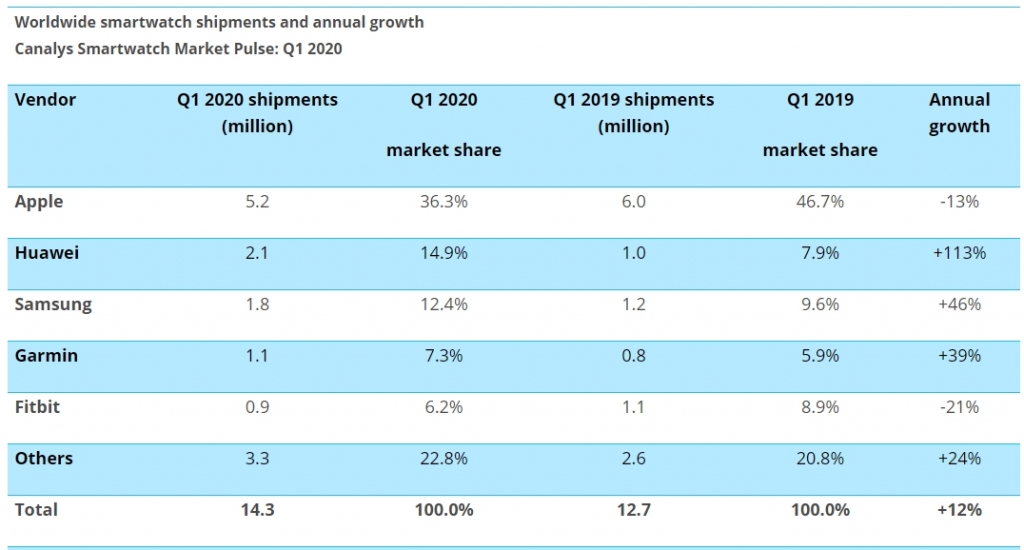 애플이 주도하고 있는 스마트워치 시장이 코로나19(COVID-19) 여파에도 1분기 출하량이 증가한 것으로 나타났다.