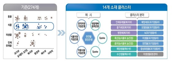 부처별로 각각 운영 중인 274개의 소재자원은행을 구조 조정해 14개 분야별 바이오 소재 클러스터를 조성한다. 이를테면 한약자원거점은행, 식품자원거점은행, 대량재배협력은행, 약용식물거점은행 등은 ‘천연물 중앙은행’으로 통합하는 식이다. 과기정통부는 클러스터별로 책임부처를 지정하고 전문 포털도 운영할 계획이다. 14개 소재 클러스터는 인체유래물(복지부), 줄기세포(복지부), 병원체(복지부), 축산(농식품부·농진청), 종자(농식품부·농진청), 해양생물(해수부), 수산생물(해수부), 배양세포(과기정통부), 모델동물(과기정통부), 뇌(과기정통부), 미생물(과기정통부). 천연물(과기정통부), 합성화합물(과기정통부), 야생생물(환경부) 등이다. 이를 통해 수요자가 원하는 소재 및 서비스를 적시에 제공하고, 해외의존도가 높은 연구 필수자원을 자립화한다는 목표다.