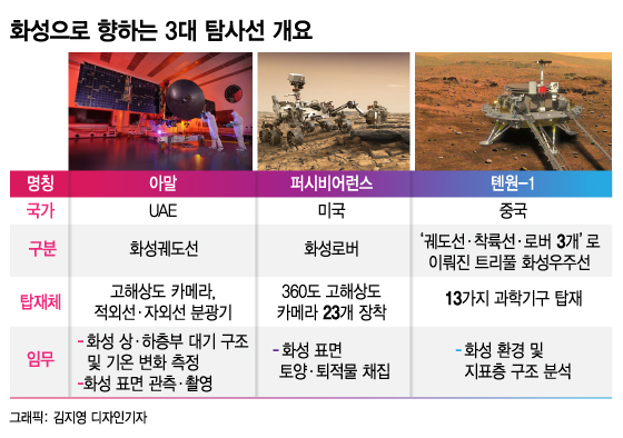 이달은 아말 말고도 화성행 우주선들이 줄 잇는다. 지구와 화성 간 거리가 약 5500만km로 가장 가까운 ‘회합주기’인 탓이다. 우주여행에 드는 에너지를 최대한 아낄 수 있는 절호의 기회다. 이때를 놓치면 2년을 더 기다려야 하는데 이때 발사체 보관 등의 추가 비용을 합산하면 약 6000억원의 비용이 더 들어가게 된다.