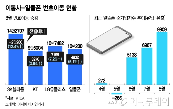 이 같은 추세에 지난 8월 SK텔레콤, KT, LG유플러스 등 이동통신 3사에서 알뜰폰으로 넘어온 순증 가입자수는 9909명으로 올들어 가장 많았다. 알뜰폰으로의 번호 이동자는 6월 5138명, 7월 6967명 등 3개월 연속 증가세를 보이는 중이다.