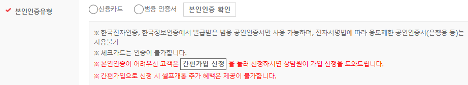 요금제를 골랐으면 유심카드 뒷면에 나와있는 일련번호를 입력하고 셀프개통을 신청하면 된다. 먼저 개인정보가 필요한 온라인 신청서를 작성해야 하는데, 여기서 본인 인증 과정이 약간은 번거로웠다. 이름과 주민등록번호로 실명인증을 한 후에도 2차 본인인증이 신용카드나 범용 공인인증서로만 가능했기 때문. 이후 주민등록증 및 운전면허증 발급일자 입력으로 또 한번 신분증을 확인한다.