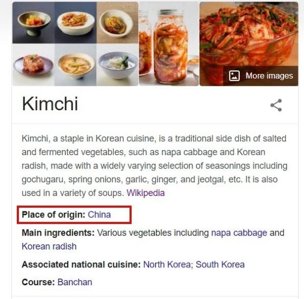 구글 영어사이트가 김치의 근원(Place of Origin)을 '중국'으로 소개했다가 항의를 받고 삭제하는 사건이 발생했다. 구글 측은 검색 결과가 자동으로 생성돼 오류가 있었다고 해명했지만 명백한 사실 왜곡이 일어났다는 점에서 비판이 제기된다.