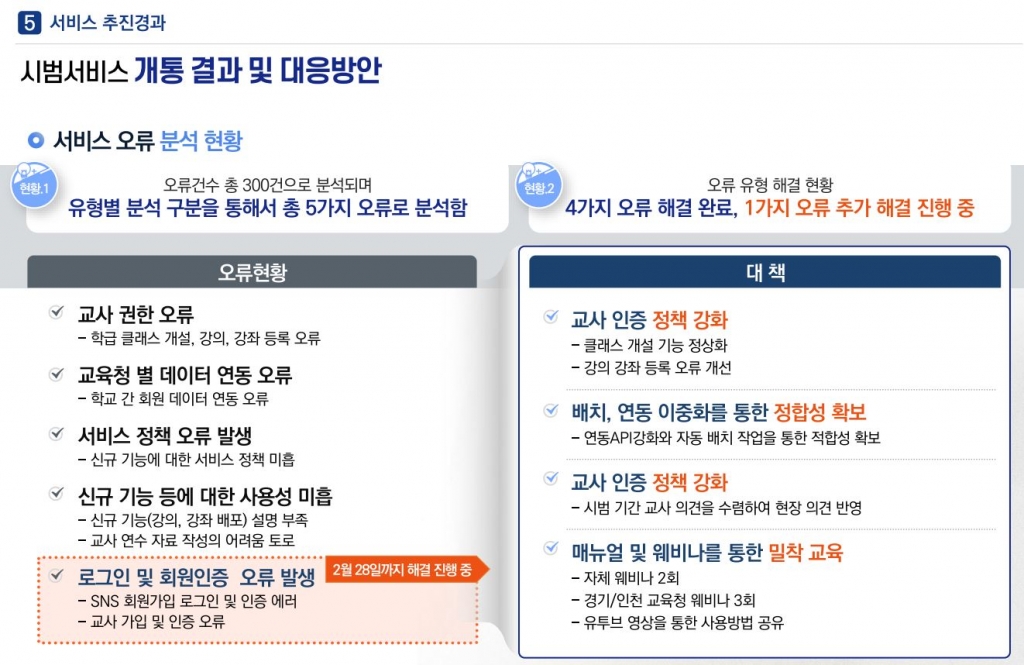 서비스 오류 분석 현황을 보면 △학습클래스 개설과 강의·강좌 등 교사 권한 오류 △학교 간 회원 데이터 등 교육청 별 데이터 연동 오류 △화상회의를 비롯한 등 신규 기능 오류 △교사들의 사용성 미흡 △카카오톡 등 SNS(사회관계망서비스) 계정과 연동한 로그인·회원 인증 오류, 교사 인증 오류 등 5가지 유형에서 300건의 오류가 보고됐다.