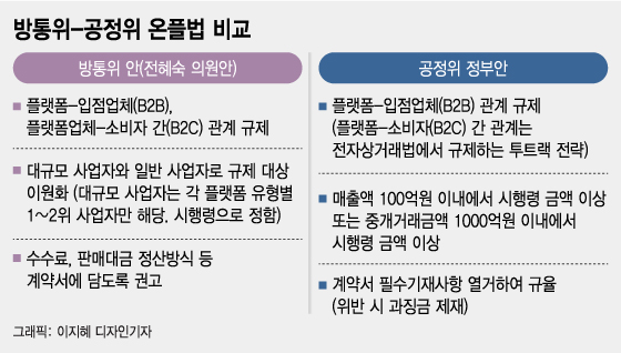 전체적으로 보면 방통위 안이 좀 더 포괄적이다. 방통위는 플랫폼-입점업체(B2B), 플랫폼-소비자(B2C) 간 관계를 모두 온플법에서 규제한다. 반면 공정위는 '투트랙'으로 간다. 온플법에서는 플랫폼-입점업체 간 불공정행위를 차단하고, 지난 5일 입법예고한 '전자상거래법 개정안'을 통해 플랫폼업체-소비자간 분쟁을 예방, 해결하겠다는 것이다.