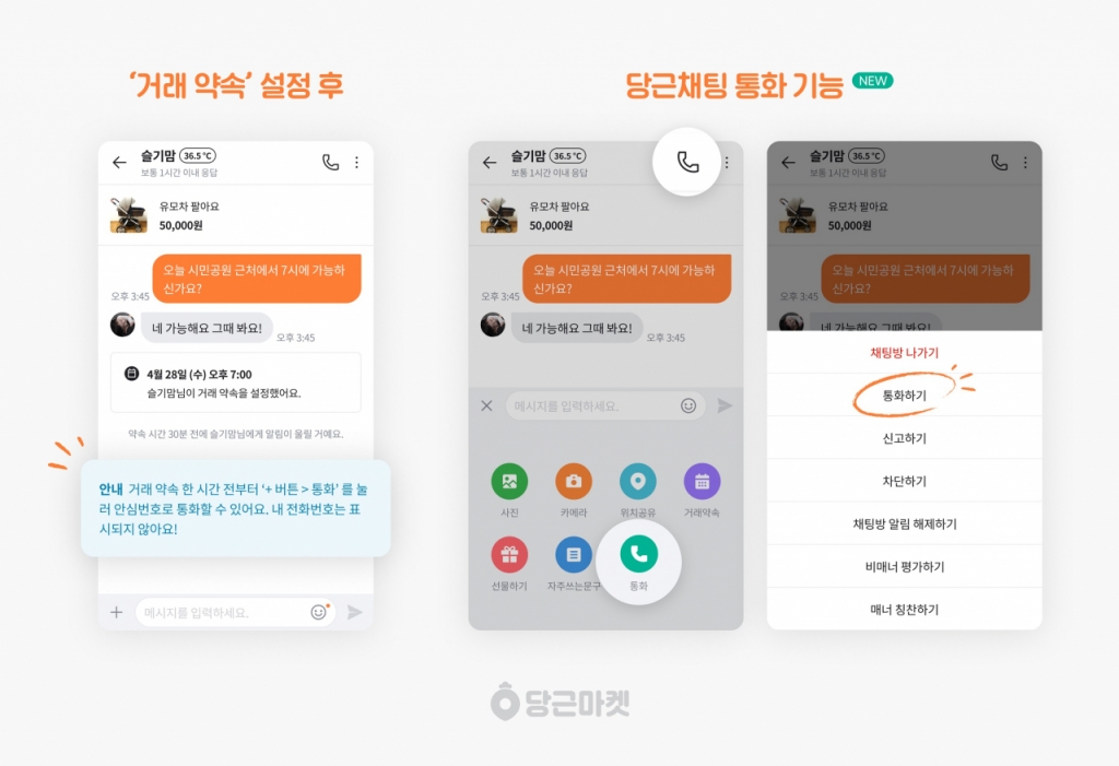 통화 기능은 채팅에서 설정한 '거래 약속' 한 시간 전후로 사용할 수 있다. 거래를 앞두고 상대방이 채팅 메시지를 확인하지 않을 경우 빠르게 연락을 하는 기능이다.