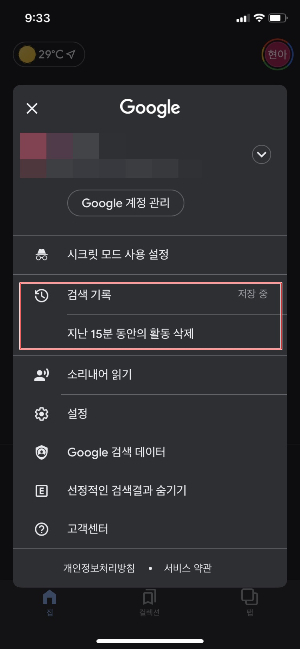 이 기능은 구글 크롬이 아닌 구글 앱에서만 이용할 수 있다. 아이폰에서 구글 앱을 실행한 뒤 페이지 우측 상단에 있는 프로필 아이콘을 누르고, 15분 내 기록 삭제 항목을 클릭하면 된다.