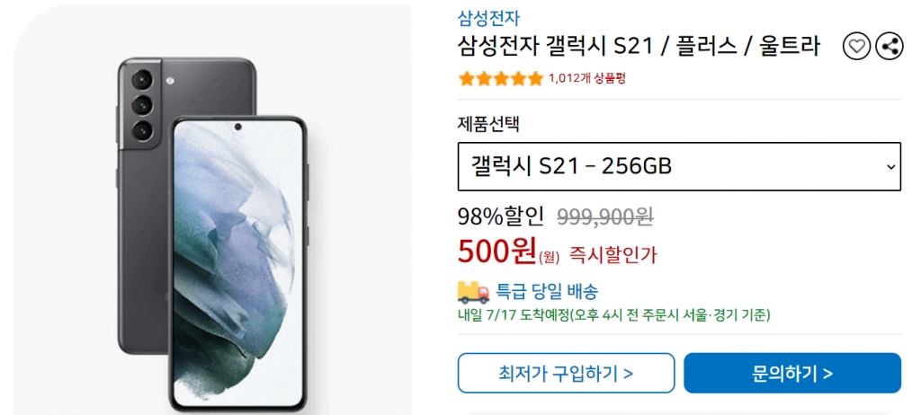 "갤럭시 S21 시리즈 단독 최저 특가 이벤트로, 월 500원에 구입이 가능하십니다. 선착순 50명 한정!"