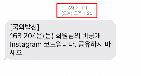 7월 18일 아침, 일어나 핸드폰을 보니 인스타그램에서 문자 메시지가 와 있었다. 인스타에 로그인 할 때 보내주는 코드 여섯 자리(168 204)였다. 발송 시간은 새벽 1시 22분이었다.