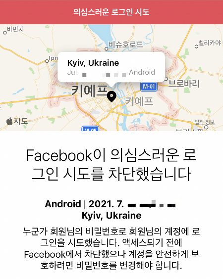 '의심스런 로그인 시도를 차단했다'는 경고가 남아 있었다. 같은 달인 7월이었다. 접속 지역은 우크라이나 키예프였고, 시도한 기기는 안드로이드 핸드폰이었다.