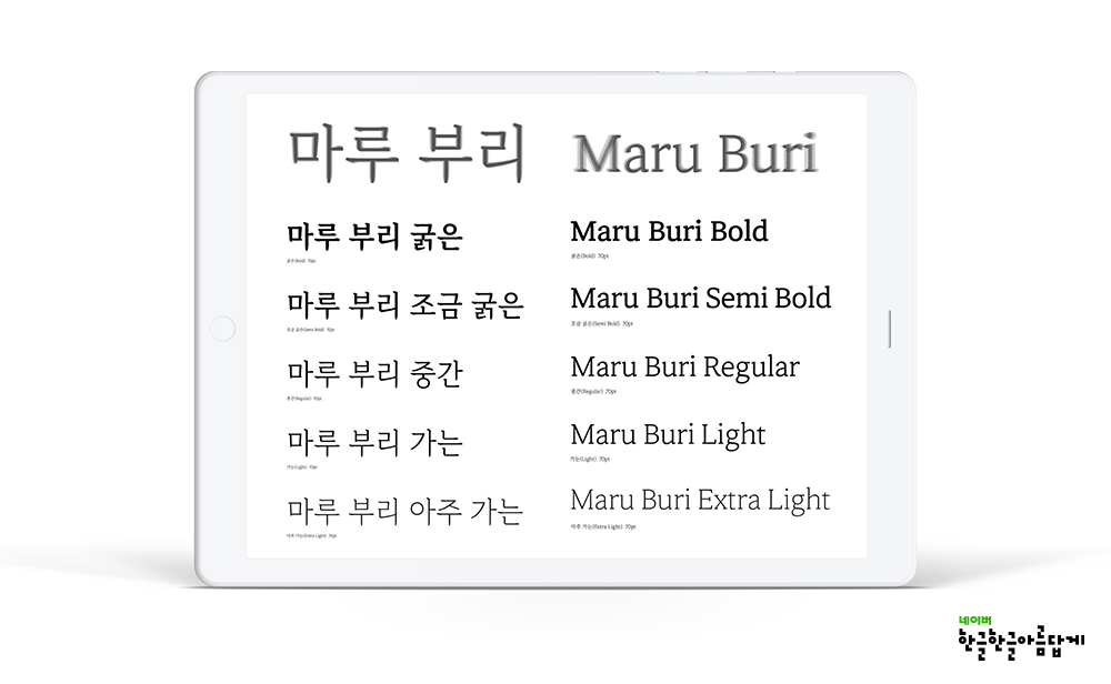네이버문화재단은 디지털 화면용 본문 글꼴 '마루 부리' 5종을 무료로 배포한다고 6일 밝혔다.