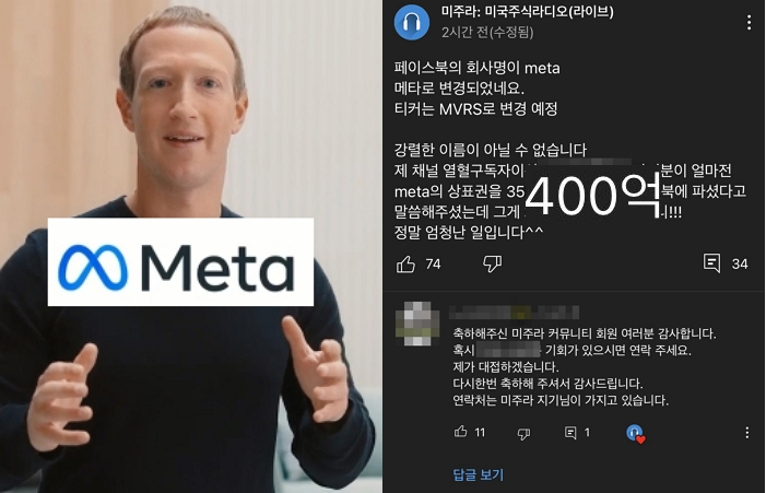 재미교포 2세가 '메타' 상표권을 갖고 있다 페이스북에 팔았다는 소식은 미국 주식시장 라이브방송 유튜버가 "제 채널 구독자의 자녀 분이 얼마 전 메타의 상표권을 3500만달러, 400억원에 페이스북에 파셨다고 한다"고 소개하면서 해당 채널 구독자들 사이에 알려졌다.