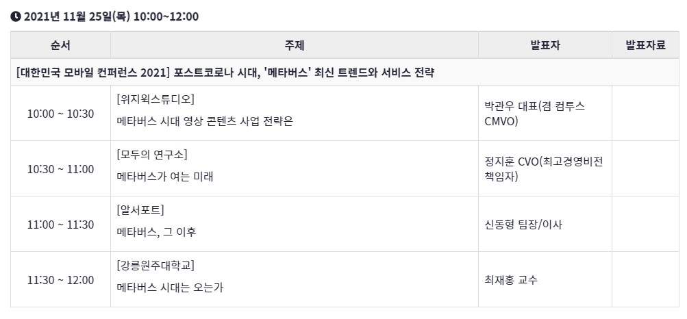 무료 온라인 행사인 이번 컨퍼런스는 먼저 박관우 위지윅스튜디오 대표가 '메타버스 시대 콘텐츠 사업전략'을 소개하고 정지훈 모두의 연구소 CVO가 '메타버스가 여는 미래'를, 신동형 알서포트 이사가 '메타버스 그 이후'를 모색한다. 아울러 최재홍 강릉원주대 교수는 '메타버스 시대는 오는가'를 주제로 발표한다