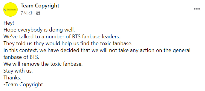 이들은 스스로를 '팀 저작권(Team Copyright)'이라고 부르며 페이스북 페이지를 운영 중이다. 방글라데시 다카에 기반을 두고 있다. 이들 페이스북 페이지 소개글에는 "우리는 비영리단체로, 깨끗한 사이버 공간을 위해 일한다"고 쓰여 있다. 이들은 "유해한 팬층을 파괴할 것"이라면서 "BTS가 무신론과 동성애를 조장한다"는 궤변을 담은 게시물을 여럿 올리고 나섰다.