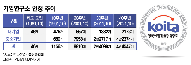 제도 도입으로 축적되기 시작한 국가 R&D 기초체력은 40년 만에 몰라보게 달라졌다. 21일 산기협에 따르면, 인정 기업연구소는 1981년 46개에 이어 1991년 1156개, 2001년 8810개, 2011 2만4099개, 올해는 4만4547개, 무려 966배로 폭풍 성장했다. 또 대기업 뿐만 아니라 중소기업도 국가 R&D의 핵심 플레이어로 성장했다. 전체 인정 대상 연구소 중에서 중소기업 비중은 95.4%로 적어도 양적 측면에선 눈부신 성과를 낳았다.