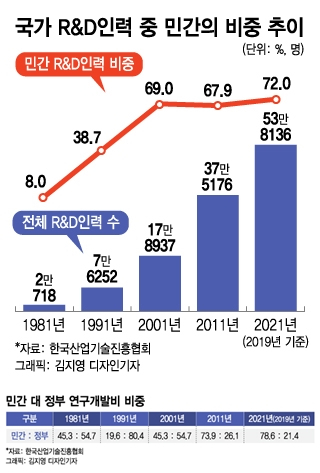 정부가 주도하던 국가 R&D 부담을 민간이 나눠지는데도 기여했다. 40년 전 국가 전체 R&D 인력의 8%에 불과했던 민간 R&D 인력 비중은 올해 72%까지 급증했다. 기업의 R&D 투자비 액수도 40년 전 1652억원에 불과했던 것이 2019년에는 71조5067억원으로, 무려 432.8배가 됐다.