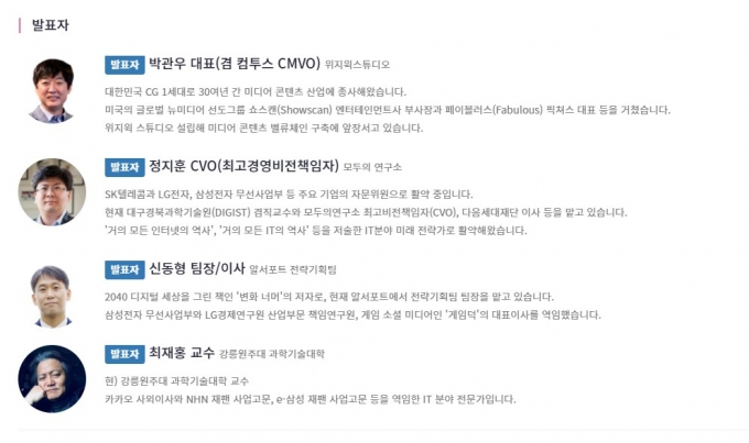 무료 온라인 행사인 이번 컨퍼런스는 먼저 박관우 위지윅스튜디오 대표가 '메타버스 시대 콘텐츠 사업전략'을 소개하고 정지훈 모두의 연구소 CVO가 '메타버스가 여는 미래'를, 신동형 알서포트 이사가 '메타버스 그 이후'를 모색한다. 아울러 최재홍 강릉원주대 교수는 '메타버스 시대는 오는가'를 주제로 발표한다