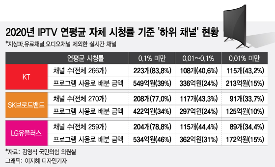 26일 국회 과학기술정보방송통신위원회 소속 김영식 국민의힘 의원이 국내 IPTV 3사에서 받은 '작년 IPTV 연평균 자체 시청률' 자료에 따르면, KT는 전체 266개 채널 중에서 83.8%(223개), SK브로드밴드는 270개 채널 중 77.0%(208개), LG유플러스는 259개 채널 중 78.8%(204개)의 연평균 시청률이 0.1%에 못 미쳤다.