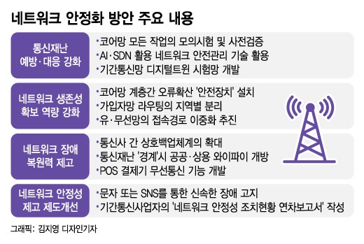 주요 기간통신사업자의 네트워크 오류 예방·대응 체계도 손 본다. 전국망에 영향을 줄 수 있는 '코어망' 작업은 모의시험을 통한 사전검증을 코어망을 거치도록 했고, 승인된 작업자·장비·작업시간에만 허용하도록 통제를 강화하며, 이상감지 시스템 구축을 검토한다. 또 AI(인공지능)와 SDN(소프트웨어 기반 네트워크 제어 기술)을 네트워크 안전관리 기술에 확대 적용하고, 기간통신망의 사전 시험검증이 가능하도록 실제 통신망과 유사한 '디지털트윈'을 개발한다.