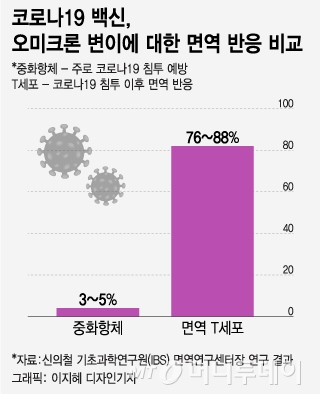 ▶현재 백신은 원래의 코로나19 우한주(SARS-CoV2)에 대해 만들어진 백신이다. 백신을 맞고 형성되는 중화항체가 오미크론을 잘 잡아주지 못 한다. 오미크론 변이에 대한 중화항체 작동 수준은 우한주에 비해 3~5%수준이다. 그러나 면역반응의 또 다른 축인 T세포 연구에선 T세포들은 여전히 오미크론을 잘 인식하고 방어한다는 사실이 밝혀졌다. T세포 면역 반응은 우한주에 비해 76~88% 이상 유지하고 있다. 백신으로 유발되는 몸 속 면역 반응이 완전히 무용지물이 되지 않는다는 이야기다.