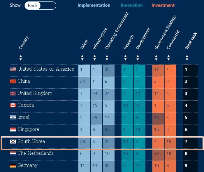 영국 데이터 분석업체인 토터스 인텔리전스(Tortoise Intelligence)가 공개한 최근 '글로벌 AI 지수' 조사결과에 따르면 올해 한국의 종합순위는 7위로 지난 조사보다 두 계단 하락했다. 지난해까지 앞섰던 이스라엘과 싱가포르를 앞섰는데 밀렸다. 종합순위에서 한국을 앞선 나라는 미국과 중국, 영국, 캐나다, 이스라엘, 싱가포르 등이다. 토터스 인텔리전스의 조사는 지난해 2월 세계경제포럼(WEP) 등에서 소개됐을 정도로 각국에서 AI 경쟁력을 가늠하는 지표로 많이 활용한다.