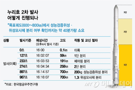 누리호가 1차 발사 실패를 딛고 2차 발사에 성공하기까진 여러 우여곡절이 있었다. 지난해 10월 1차 발사 당시 누리호는 고도 700㎞에 위성모사체를 목표궤도에 안착시키지 못해 실패했다. 누리호는 결함을 보완했지만, 2차 발사를 앞두고 비바람으로 한 차례, 레벨센서 이상으로 또 한 차례 발사 일정을 미뤘다.