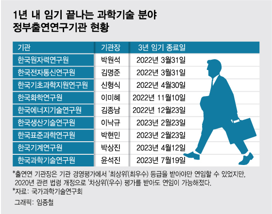 과학계의 기관장 찍어내기 악습이 수사선상에 오르면서 '3년 임기' 만료를 앞둔 현직 과학기술 출연연 기관장의 거취에도 관심이 쏠린다. 국가과학기술연구회는 2020년 중장기 기관 운영이 가능하도록 출연연 기관장 연임 조건을 대폭 개선했다. 그동안 출연연 기관장은 기관 경영평가에서 '최상위' 등급을 받아야만 연임할 수 있었지만, 관련 법령 개정으로 '우수(차상위)' 평가를 받아도 연임이 가능해졌다.