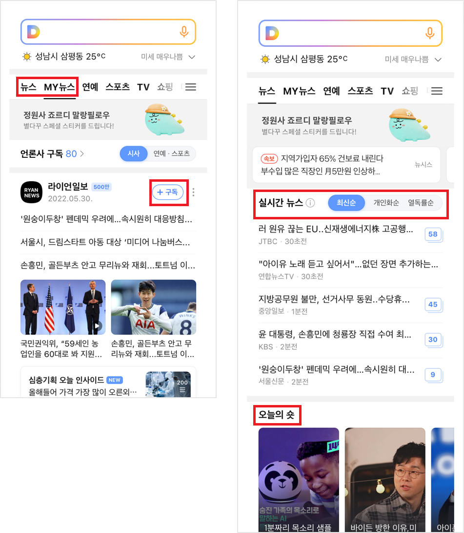 19일 업계에 따르면 카카오는 오는 25일 다음 모바일 앱 뉴스 서비스를 개편할 예정이다. 올 초 다음 앱에 적용한 'My뷰'·'발견' 등 카카오 뷰(view) 탭을 없애고 뉴스 구독 서비스를 강화하는 게 골자다. PC 웹 서비스도 순차적으로 변경한다.