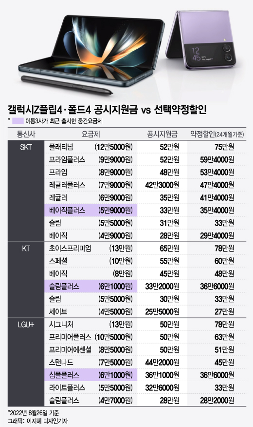 26일 업계에 따르면 이날 삼성전자는 갤럭시Z플립4·폴드4를 한국을 비롯한 전 세계 40개국에 공식 출시했다. SK텔레콤(80,900원 ▲3,100 +3.98%), KT(59,500원 ▲100 +0.17%), LG유플러스(15,330원 ▼170 -1.1%) 등 이동통신 3사가 책정한 갤럭시Z플립4·폴드4의 공시지원금은 25만5000원~65만원이다. 이는 전작의 최초 공시지원금(25만5000~50만원)보다 15만원(최대 기준) 높은 수준이다.