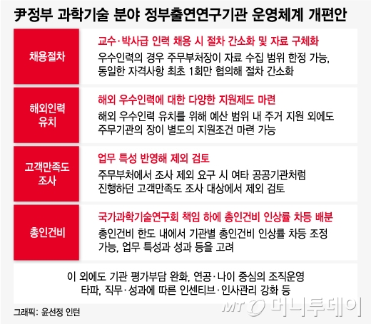 윤석열 정부는 출연연 경쟁력을 강화하려면 '인적자본' 확보가 필요하다고 보고 이에 대한 대책을 늘리기로 했다. 대표적으로 교수·박사급 인력 채용 시 절차를 간소화한다는 방침이다. 다만 채용 공정성을 위해 심사자료는 구체화한다. 이와 함께 해외 우수인력 유치를 위해 주거지원 외에도 출연연 기관장 판단에 따라 별도의 추가 지원이 가능해질 전망이다.