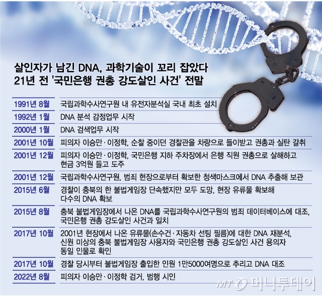 2일 국립과학수사연구원과 경찰청에 따르면 21년 전 대전 국민은행 권총 강도살인 사건은 DNA 과학수사의 발전, 살인죄 공소시효 폐지, 형사의 끈질긴 집념 등이 아우러진 결과다. 그중에서도 현장 증거가 제한된 상황에서 유일한 단서, 즉 DNA 대조를 통해 사건의 실마리가 조금씩 풀렸다.