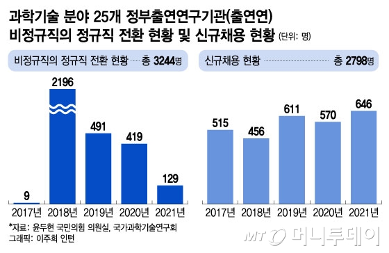 앞서 문재인 정부는 2017년 7월 비정규직의 정규직 전환 가이드라인을 발표했다. 정부 세금으로 운영되는 출연연은 정책을 이행했다. 전환 규모는 △2017년 9명 △2018년 2196명 △2019년 491명 △2020년 419명 △2021년 129명 등으로 총 3244명으로 집계됐다. 특히 관련 정책이 첫 실현되던 2018년에는 한 해 2196명(68%)이 전환됐다.