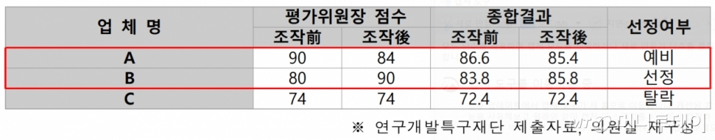 18일 국회 과학기술정보방송통신위원회(과방위) 소속 정필모 더불어민주당 의원실에 따르면, 특구재단 대구본부는 '대구창업캠퍼스 운영지원 사업' 입찰 평가서를 조작했다. 당시 입찰에는 3개 기업이 참여했다. 최초 선정결과를 보면 A업체가 86.6점으로 1위(선정), B업체가 83.8점으로 2위(예비)로 나타났다. 하지만 실제 사업에는 B업체가 선정되며 1·2위 결과가 뒤집혔다.