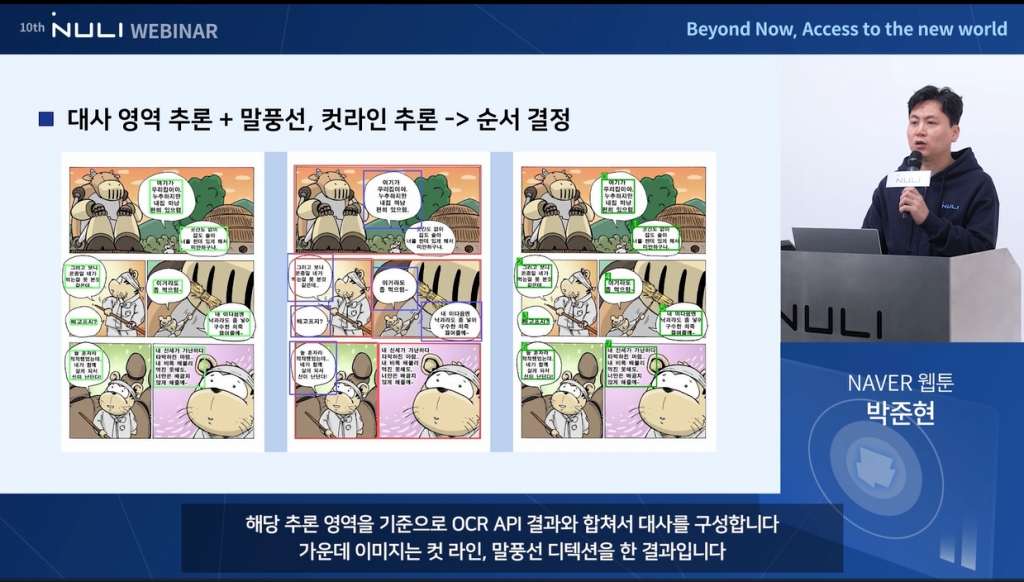 네이버웹툰은 5일 '제10회2022 널리 세미나: 현재를 넘어, 새로운 세상으로의 접근' 웨비나에서 AI 기술을 활용한 웹툰 대체 텍스트 제공 기술을 처음 공개했다.
