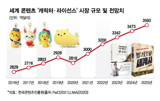 해외 콘텐츠 강자들은 일찌감치 주목한 수익모델이다. 한국콘텐츠진흥원 보고서에 따르면, IP커머스를 포괄하는 '캐릭터·라이선스 부문'의 글로벌 시장 규모는 작년 기준 약 3000억달러(393조원)로, 전체 콘텐츠 시장 규모의 10.8%였다. 특히 콘텐츠 최강국인 미국의 작년 시장 규모는 약 1625억달러(213조원)로, 전 세계 캐릭터·라이선스 시장의 과반을 차지했다.