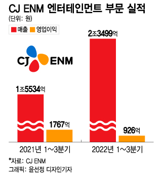 CJ ENM 엔터 부문의 지난해 1~3분기 누적 매출은 2조3499억원으로 전년 동기(1조5534억원) 대비 51% 증가했으나, 영업이익은 926억원으로 47% 줄었다. 특히 엔터 부문 매출의 80%를 차지하는 미디어부문은 3분기 영업손실 141억원으로 적자전환했다.
