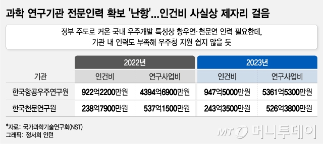 윤석열 정부가 역점 추진 중인 우주항공청 윤곽이 드러난 가운데, 초기 중심적인 역할을 해야 할 과학기술 분야 정부출연연구기관(출연연)은 인력 부족에 허덕인다. 국내 우주개발 생태계는 정부 주도로 커온 특성상 우주청 개청에 한국항공우주연구원과 한국천문연구원 등 출연연 역할이 필수적이다. 하지만 이들 기관조차 인력 수급에 난항을 겪고 있어 우주청 지원에 어려움이 예상된다.