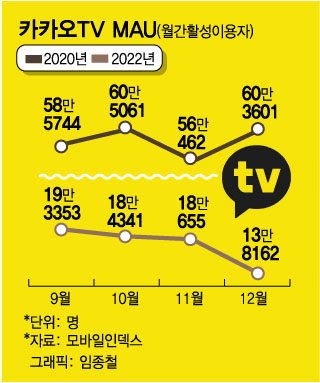 카카오TV에서만 볼 수 있는 콘텐츠가 사라지면서 이용자도 급감하는 추세다. 모바일인덱스에 따르면 카카오TV 앱 개편 직후인 2020년 말 60만3601명까지 치솟았던 MAU(월간활성이용자)는 2022년 말 13만8162명 수준으로 쪼그라들었다. 2년 만에 약 77% 감소한 셈이다.