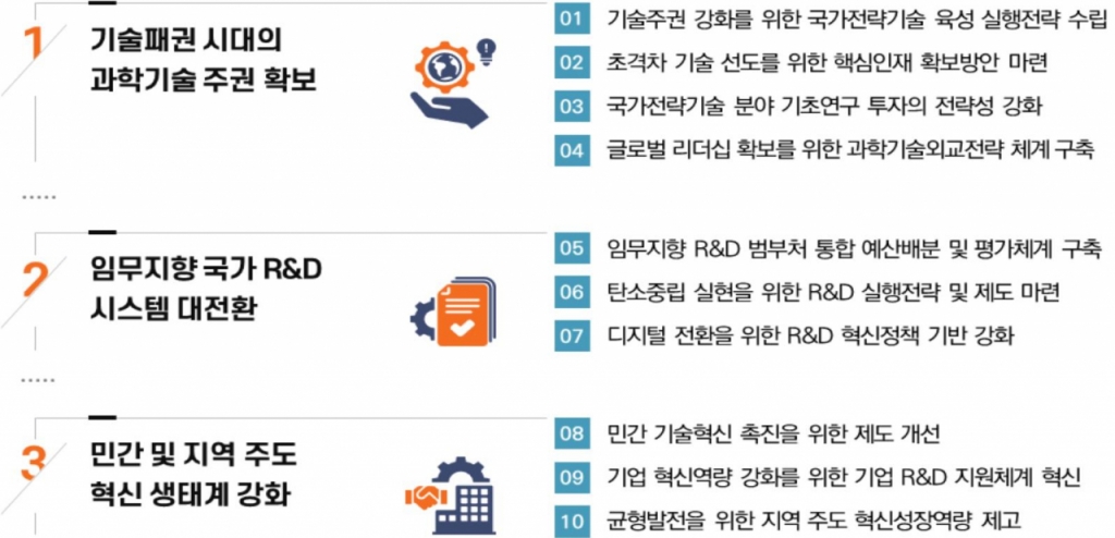 정 원장은 정부가 질적 성장을 주요 정책 목표로 설정한 것에 발맞춰 12대 국가전략기술과 같은 국가 수요 기반 연구를 지원하겠다고 밝혔다. 12대 전략기술은 지난해 10월 '제2·3의 반도체' 기술을 만들어 패권경쟁에 대비하자는 취지로 민관이 함께 꼽은 분야다. △반도체·디스플레이 △이차전지 △인공지능 △첨단모빌리티 △차세대원자력 △첨단바이오 △우주항공·해양 △수소 △사이버보안 △차세대통신 △첨단로봇·제조 △양자 등이다.