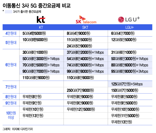 SK텔레콤(80,900원 ▲3,100 +3.98%), LG유플러스(15,330원 ▼170 -1.1%)에 이어 KT(59,500원 ▲100 +0.17%)도 5G 중간요금제를 추가로 출시한다. 데이터 제공량과 가격 측면에서 3사 모두 비슷한 수준으로 출시됐다. SK텔레콤은 '맞춤형 요금제', KT는 '직관적인 요금제 구조', LG유플러스는 '가장빠른 QoS(데이터 소진 시 속도제한)'를 차별성으로 내세웠다. 3사는 지난해 8월 중간요금제를 출시한 바 있다. 하지만 24~110GB 사이 요금제가 없어 더 다양한 요금제가 필요하다는 지적을 받아왔다. 이번 요금제 추가 출시로 고객 선택권이 넓어질 것으로 업계는 기대한다.