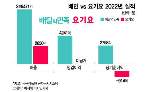 배달업계 1·2위 격차는 더 벌어졌다. 배민 운영사인 우아한형제들은 지난해 매출이 전년 대비 47% 증가한 2조9471억원을 기록했다. 영업이익(4241억원)과 당기순이익(2758억원)도 크게 늘며 흑자 전환했다. 그야말로 사상 최대 실적이다.