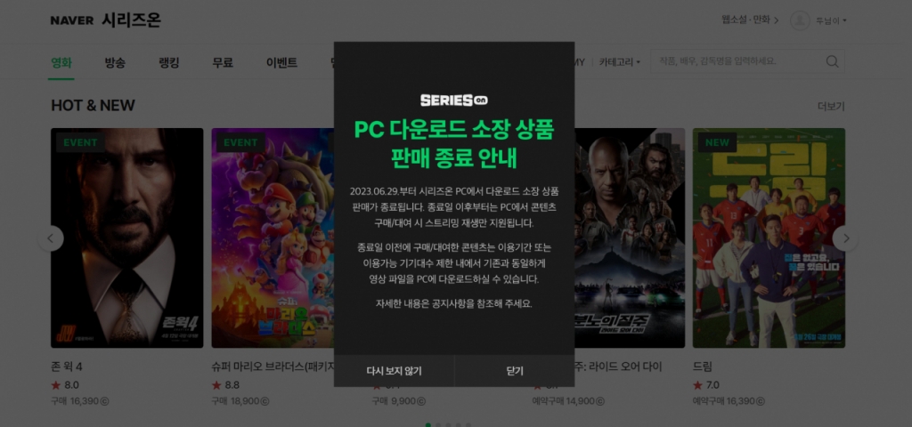 14일 업계에 따르면 네이버 시리즈온은 오는 29일부터 PC 다운로드 소장 상품 판매를 종료한다고 지난 12일 공지했다. 단, 스마트폰과 태블릿PC용 시리즈온 앱에서는 다운로드 서비스를 계속 이용할 수 있다. 29일부터 PC에서는 스트리밍 방식으로만 영화와 방송 프로그램을 감상할 수 있다.
